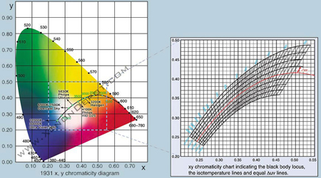 A black body (perfect radiant body) is an ideal object that absorbs all energy, changes its colour from red through yellow to white as its temperature increases. The absolute temperature T (K) of the black body is referred to as the colour temperature and colour by a locus (black body locus).
