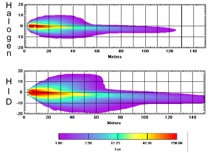 . A 35W HID light source produced up to 3 x the lumens at the light source when compared to a 55W halogen bulbs.